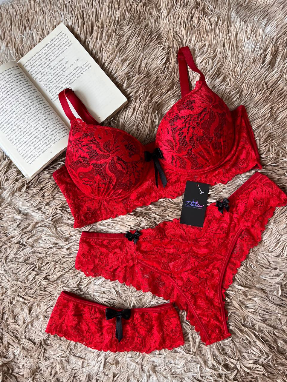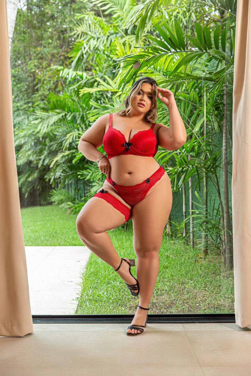 O sutiã em renda com bojo estruturado e alças reguláveis reforçadas oferece sustentação e realce ao colo, enquanto a calcinha rendada completa o conjunto com charme e feminilidade. Acompanha persex, trazendo um toque extra de sedução à peça.