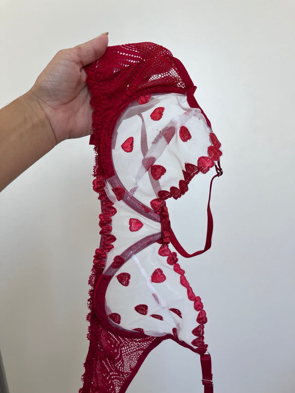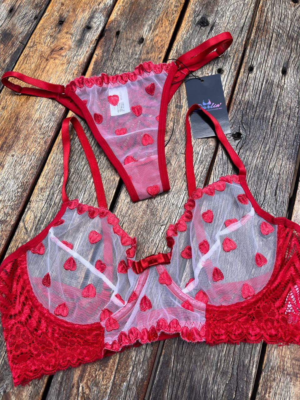 Conjunto Romance em tule transparente bordado com corações