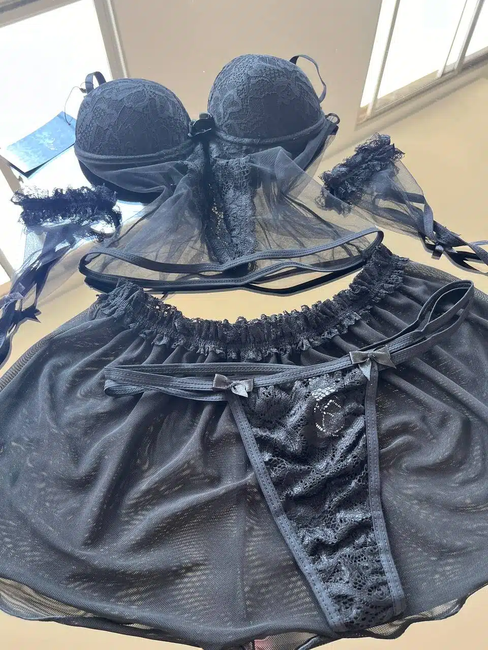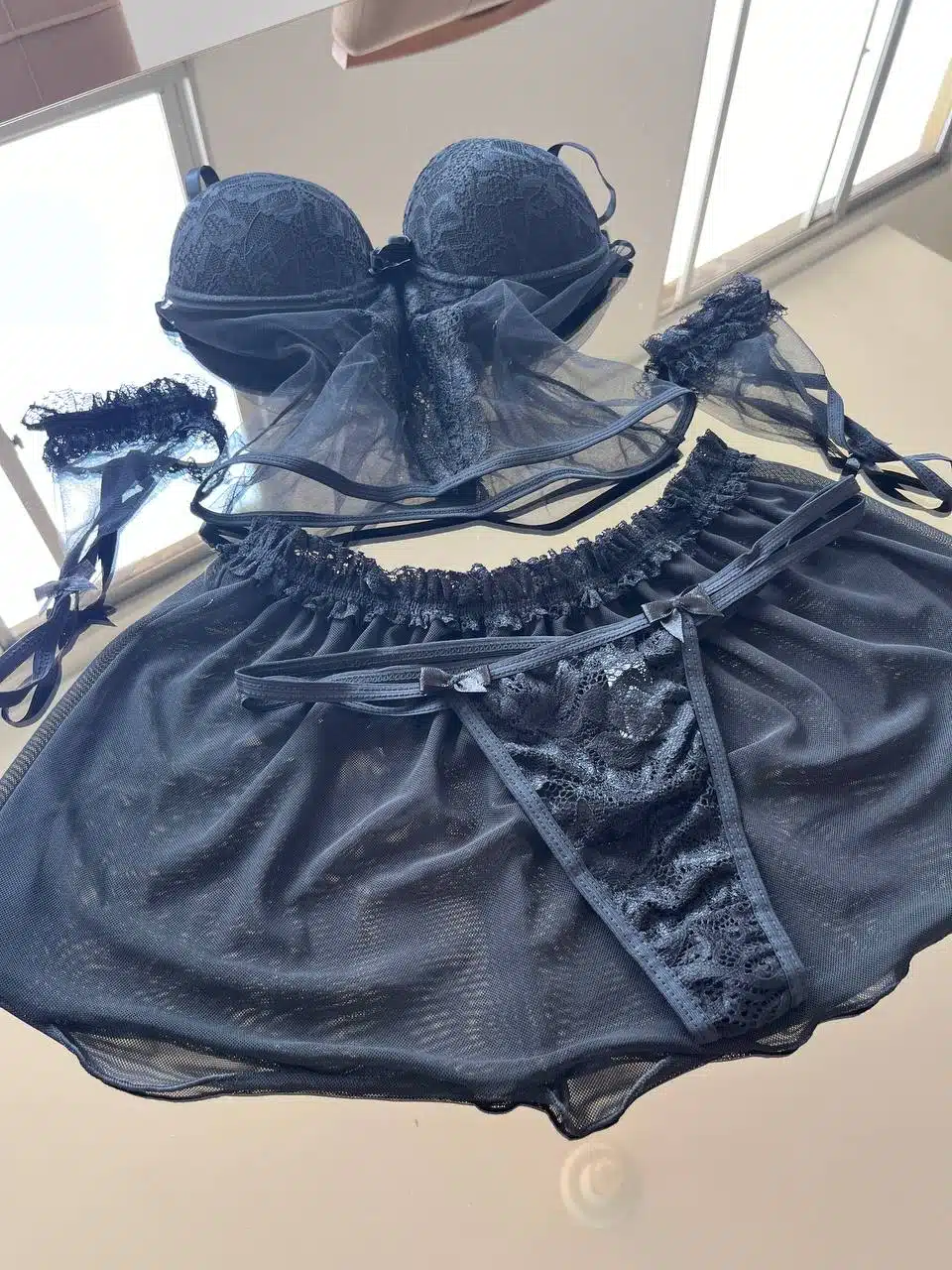 O Conjunto Seraphine em renda e tule com saia e luvas foi criado para mulheres que desejam explorar sua sensualidade com elegância e poder. Seu design sofisticado combina renda delicada e tule transparente, criando um visual envolvente e irresistível.